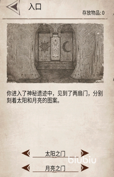 在进入到遗迹之前,我们身上的物资,武器和道具都需要备足了才可以。在消耗完物品之后,我们前进会遇到两扇门,分别是太阳之门和月亮之门。我们想要拿到更多的材料的话,就不能选择太阳之门,我们需要选择月亮之门。