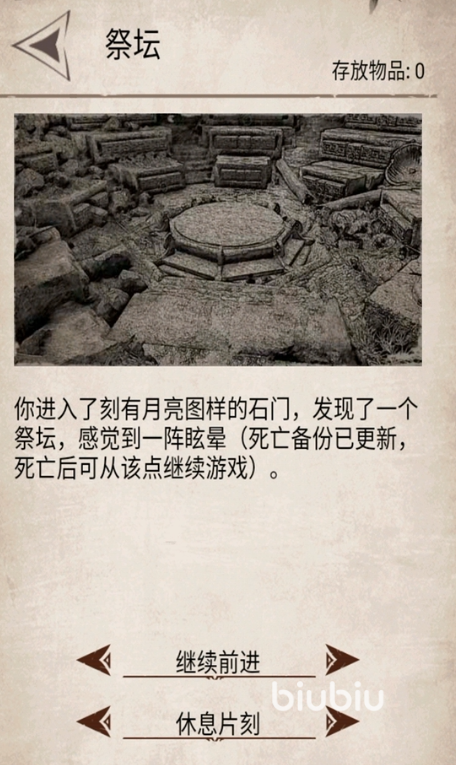 在进入之后我们来到祭坛,这里可以进行保存,在保存好后可以继续深入。前面会有一个箱子,箱子本身需要耗费60分钟才可以开启,里面的物资比较随机,一般是两件。
