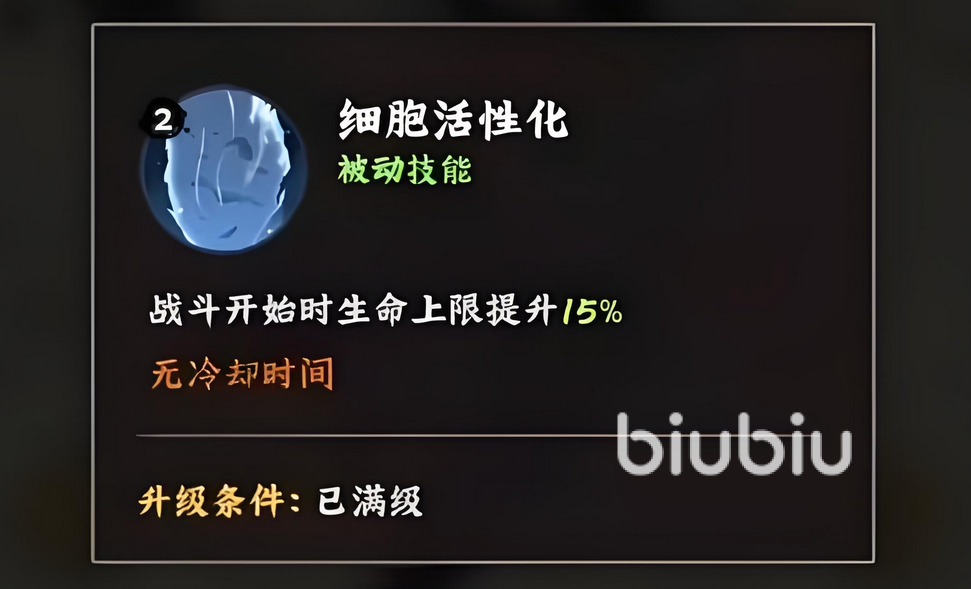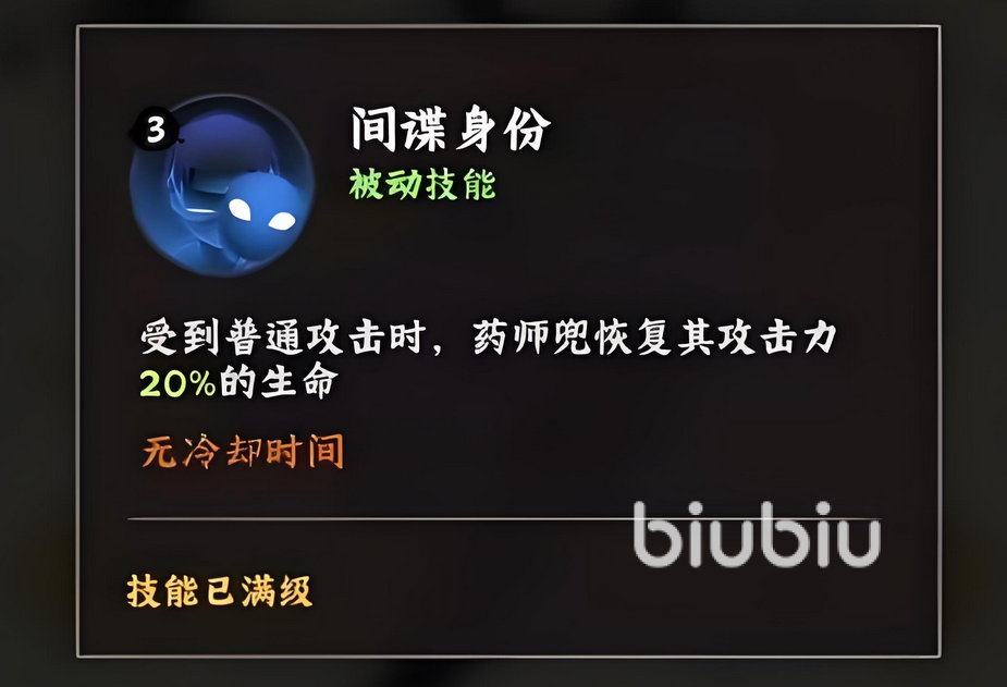 接下来是第1个被动间谍身份,在药师兜受到普通攻击时,会按照攻击力的20%恢复生命值,此效果没有冷却时间。第2个被动技能细胞活性化,在战斗开始时生命上限提升15%。药师兜的技能比较简单,两个被动主要提升的是生命恢复和生命上限,都是强化的生存能力,最大的作用就是自身的主动技能所带来的高额减速。