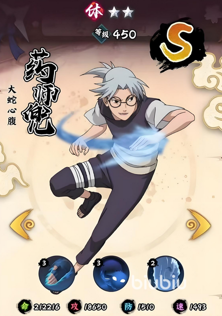 这样的效果就注定了药师兜在阵容搭配的时候是一个只能用来减速的挂件,和放到前排稍微扛一些伤害的肉盾。如果在战斗过程中需要减速,那么就可以将他带上,也可以用于大多数平民玩家的前排过度肉盾。例如大家只需要通过首充获取到了大蛇丸和佐助之后,再通过招募的方式获取到了药师兜,这样输出和肉盾都有了合适的选项。