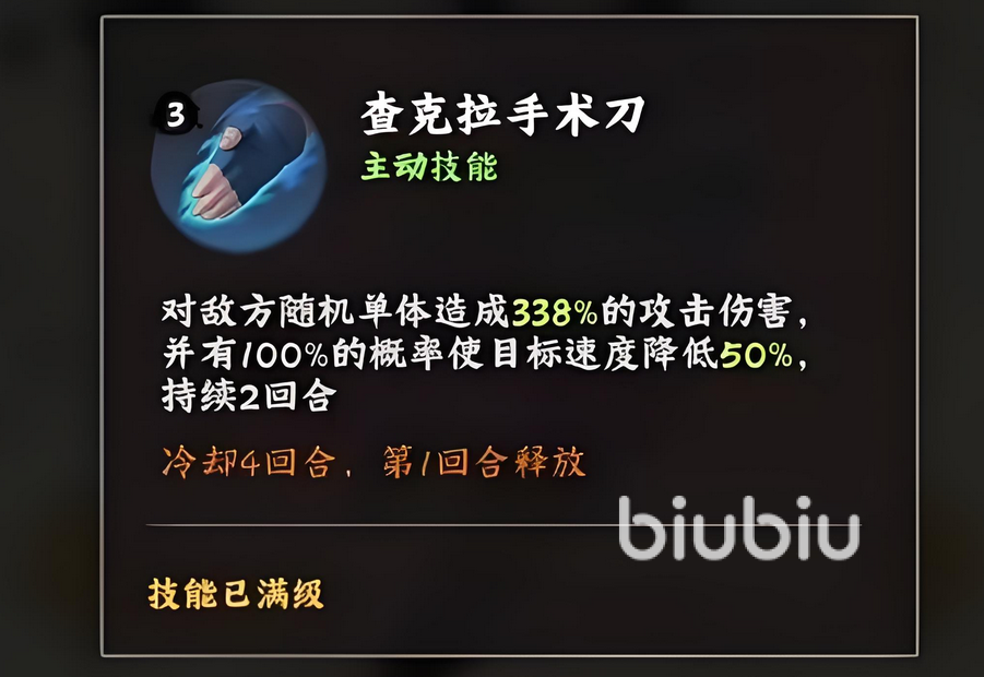 药师兜自身因为体质比较低,所以只有三个技能。第1个是主动技能查克拉手术刀,对敌方随机单位造成338%攻击力的伤害,并有100%的几率使目标速度降低50%,速度降低效果持续两回合。该主动技能在第一回合释放,有四回合的冷却时间,而且小编介绍的是达到满级之后的效果。
