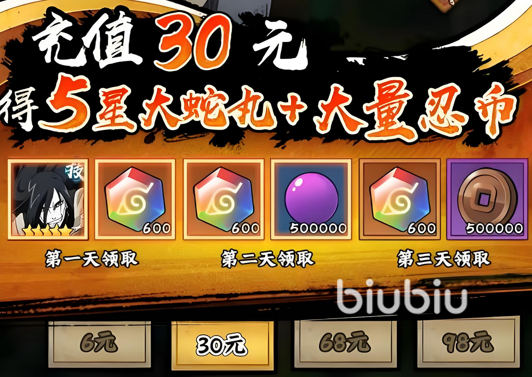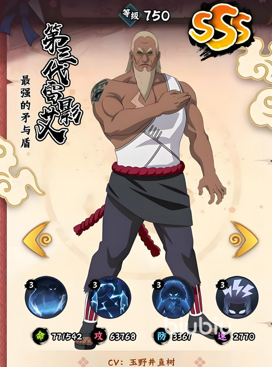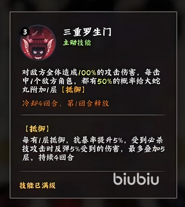 在游戏中通过首充就可以直接获得大蛇丸,这也是很多玩家都会使用这个忍者的重要原因。另一个原因就是自身的技能非常强悍,无论是主动还是被动都是如此。大蛇丸的主动技能三重罗生门,对敌方全体造成100%攻击力的伤害,每击中一个敌方角色,都有50%的几率,给大蛇丸附加一层抵御效果。每带有一层抵御,可提升5%的抗暴率,在受到必杀技攻击时,会反弹部分伤害此,效果最多叠加到5层,每层持续4回合。