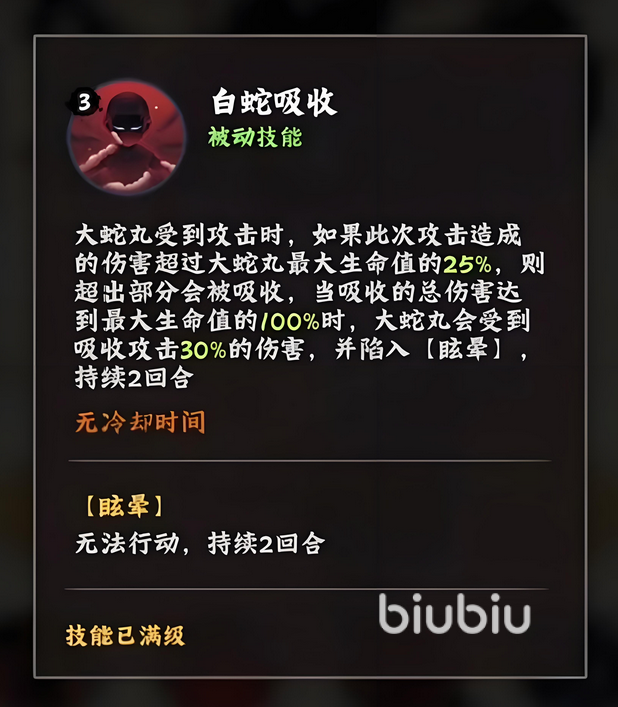 被动技能咒印术,在大蛇丸受到攻击时,有50%的几率给对方附加一层咒印。在大蛇丸即将阵亡时,会选择当前携带咒印最高的一名角色,按照大蛇丸自身血量的30%造成伤害,并以30%的血量再生,将场上的所有咒印效果清除。对方每有一层咒印,会提升2%的攻击,降低5%防御,最多叠加10层。这样被动效果叠加起来之后,对方的防御将会变得非常脆弱,很容易就被我方集火秒掉。