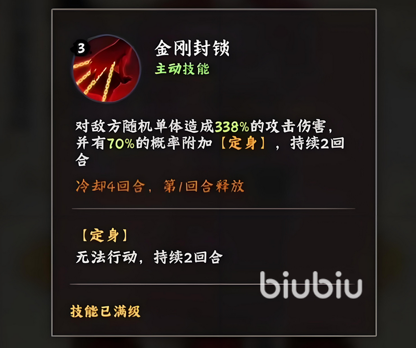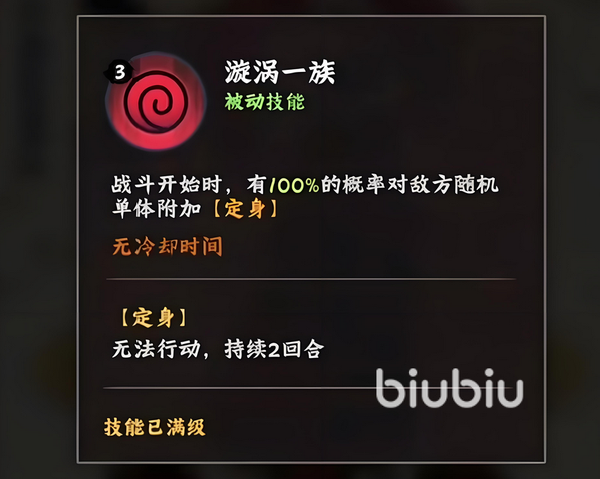 漩涡玖辛奈的主动技能金刚封锁,可对敌方随机单位造成338%的攻击力伤害,并有70%的几率附加定身,持续两个回合。对方被定身之后就无法行动,而且不用担心受到攻击后会解除效果,这一点比束缚要好一些。被动技能漩涡一族在战斗开始时有100%的几率对敌方随机单位附加定身,这个定身效果同样持续两个回合。