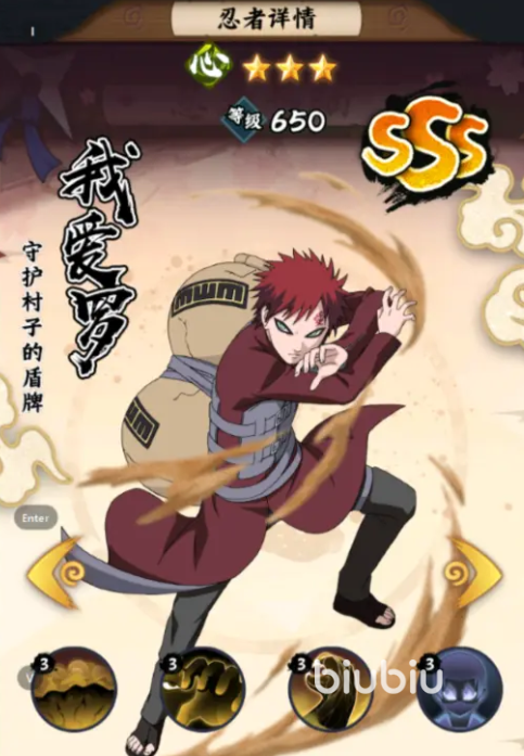 他能降低敌方的攻击力,提升队伍全体的防御、抗暴,并且有概率清除对方敌人的增益,提升我方整体实力,我爱罗也是前排辅助,他能够给队伍添加护盾,并且有50%概率沉默敌人,牵制住敌方的进攻节奏,为我方创造输出空间。