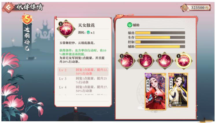 迪丽冷巴四技能,天女散花,和2技一样,群技。在团队作战的时候有一定几率触发,触发后可以为其他队友回复1点能量,并提升最高百分之三十的行动条。这个技能就非常厉害了,虽然触发概率不高,但是在每次对局中触发哪怕一次都可能决定战场对决的胜负。特别是当技能触发在高输出卡牌身上,很可能就是一波留。