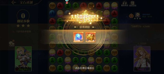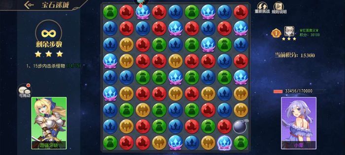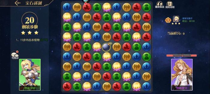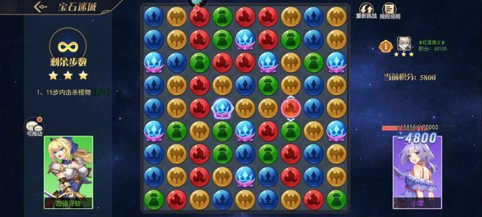 该副本对大家的战力没有需求,而且类似于消消乐的玩法。如上图所示,每次可以将相邻位置的宝石进行位置交换,如果横竖凑齐三个或以上一样的就可以消除,对右侧的敌人造成伤害。游戏通关的目标就是将敌人的血量降低为0。如果一次移动可以消除多个宝石的话,那么伤害也会大大增加。