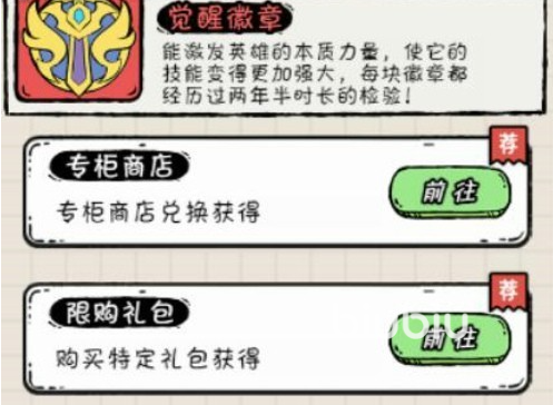 那么觉醒徽章到底能够发挥什么样的作用呢,首先是可以将英雄的潜能给激发出来,将他们的技能进行强化,这样就可以将角色的战斗力增强了,有两种方式可以获得觉醒徽章,一种是在专柜商店里面去兑换,另外一个方法就是购买特定的礼包才能得到觉醒徽章。