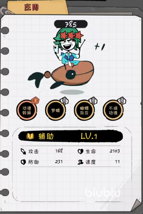 接下来介绍的角色是庄周,这位角色是一位中路角色,他的定位是属于辅助。但是这位本身的自我回复能力很强。每一回合都可以回复自身80%攻击力的生命值,并且他自身还可以还有着75%的概率清除自身或者我方队友的控制状态。庄周最强的地方在于他的另一个被动蝴蝶效应,这个技能可以提高庄周30%的生命值和20%免伤,在开场的时候会给我方攻击最高的单位提供80%的免控和5%的速度,持续两个回合。