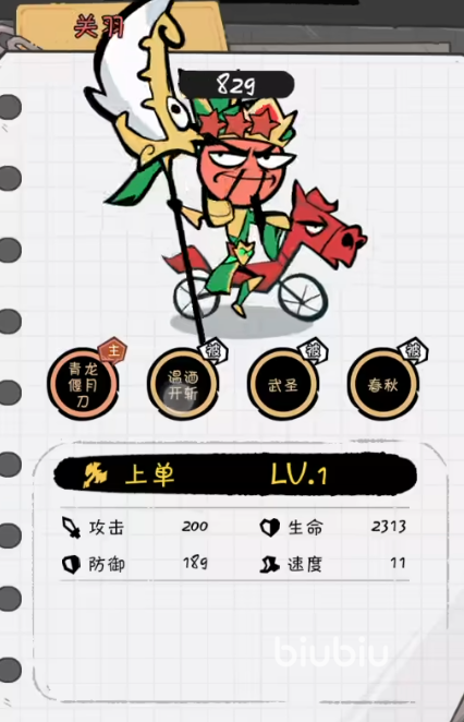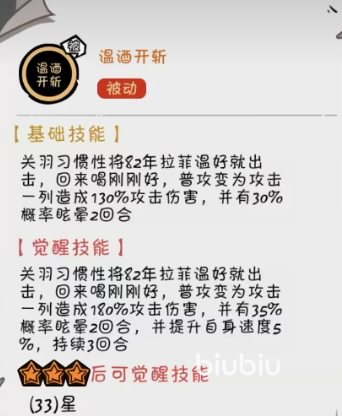 关羽这位角色是属于控制性上单,并且还是双控,这是非常难得的。他的被动技能是温酒,这个被动是让原本攻击单个单位的普攻变成可以对一列敌人造成伤害。并且还有基础30%的几率可以将敌人进行眩晕,眩晕持续两个回合。在升级之后关羽的攻击力和眩晕几率都会得到提升,同时还可以在3回合内提高自身的速度。关羽主动技能是对3个敌人造成至少300%的攻击,同时还有着40%的概率会被眩晕两个回合。在技能觉醒后攻击力会变成360%,同时眩晕的几率也变成了50%。