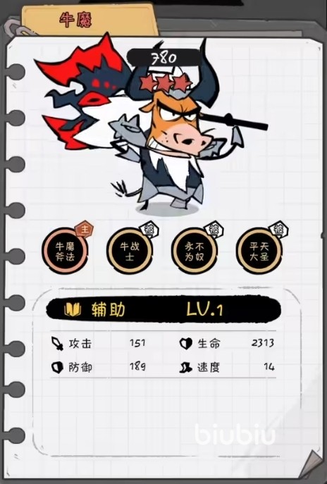 牛魔,给孙悟空作为专属辅助上场。本身在场的时候还能给我方攻击力最高的单位提升卓越的攻击伤害加成和免伤效果,加上与悟空同属性的羁绊加持,基本上可以称之为悟空猴子的专属挂件辅助,有猴子的阵容基本都得带一个牛。