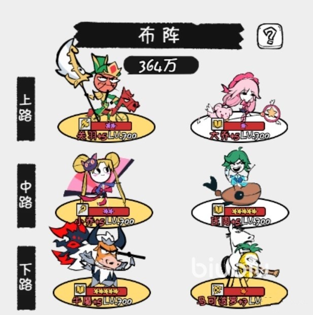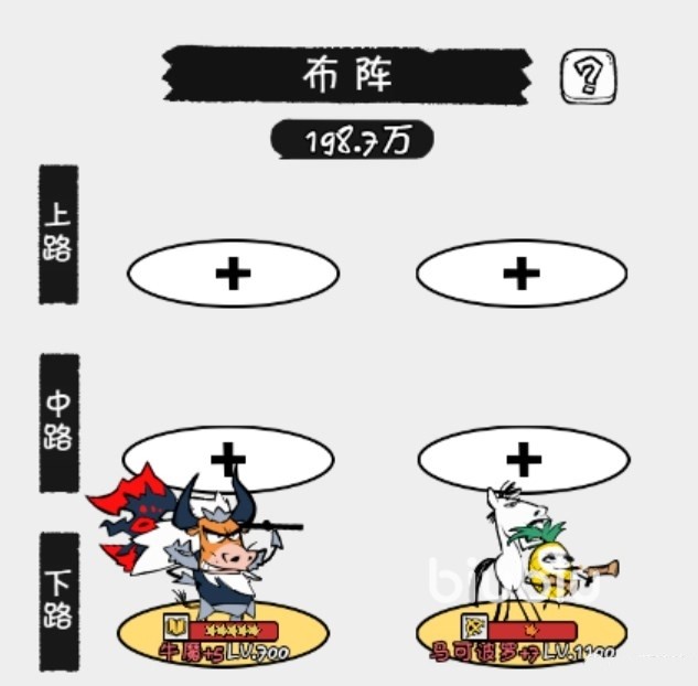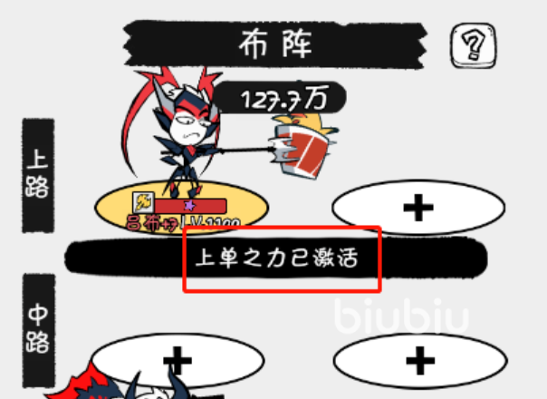 然后就是布阵,要根据自己的培养主C的特点去站位,上路一般是给到上单和打野位角色的,可以给上单角色提供5%的攻击和血量加成,打野提供10%攻击加成;中路给中单提供5%攻击和速度加成,给大家提供10%速度加成,下路是符合与射手路,给射手提供5%攻击和5%暴率加成,辅助提供5%生命和5%速度。以马可波罗为例,作为射手,自然是摆放在下路,而牛魔也是一样。如果培养的是吕布作为主C,自然是将他放在上路。