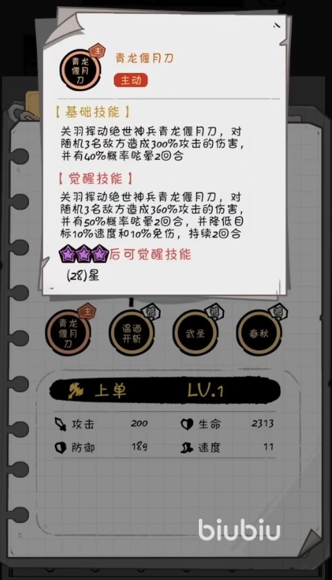 主动技能方面,青龙弯月刀可以对敌方随机三名敌人造成高额攻击力的加成伤害,另外还能概率给予敌方眩晕效果。觉醒后该技能除了提供上述更高的伤害以及更高的眩晕概率以外,还能降低目标10%的速度和免伤,相当于挂了一层虚弱,非常好用。