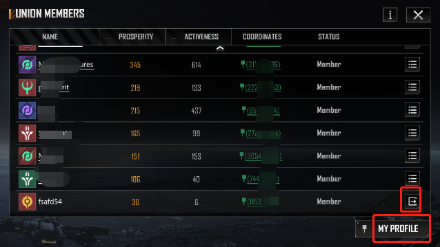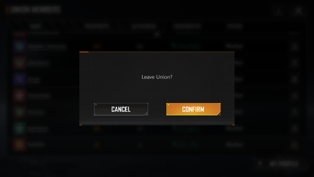 2、点击最下方的“MY PROFILE”可以迅速找到自己的位置,点击自己名字最右侧的按钮系统会提升大家“Leave Union?”。点击“CANCEL”取消退出,点击“CONFIRM”确认退出联盟,确认后将会立即生效。