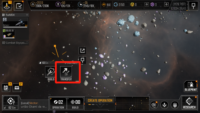 2、点击一片位置的区域,系统会提升大家使用两个操作,分别是BUILD(建造)、TRANSFER(移动),点击移动后战舰就可以自动前往未知区域。