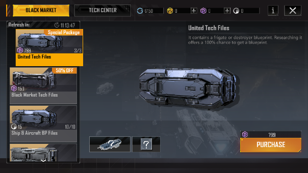 2、玩家还可以使用1个技术点来研究每个“黑市文件”。15个技术点可以用来购买一个“船舶和飞机BP文件”。研究这个文件,可提供100%的机会获得蓝图。