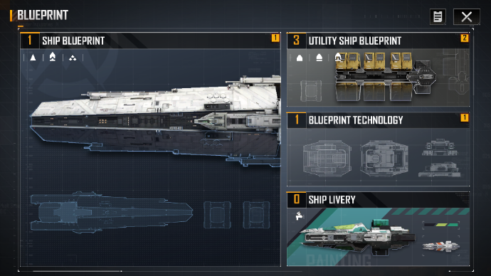 2、主力舰:一艘主力舰的蓝图有许多不同的模型。每个变体提供不同的功能和特性。玩家可以研究技术文件来解锁新模型。EXP、Active Service和Tech Points都在不同的blueprint模型中共享。
