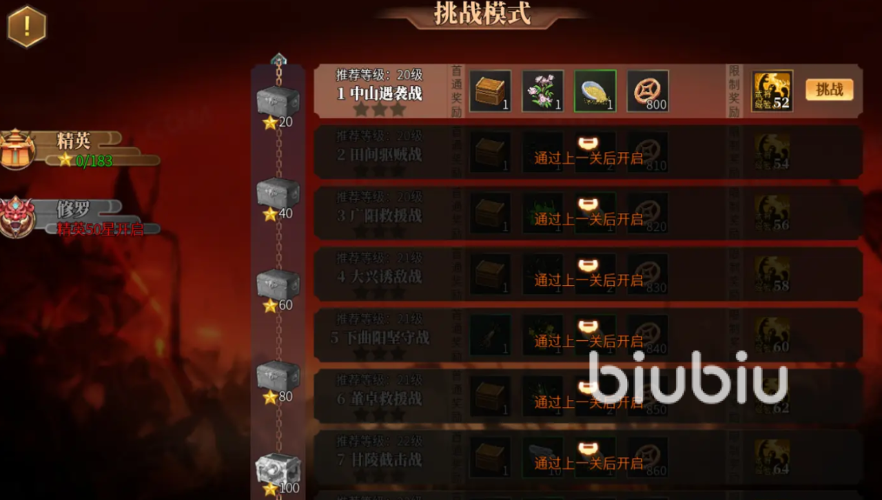 挑战模式是大家通过历史画卷第10关后才会开启的玩法,通关能帮助我们提升手上角色的上限,还能获得各种提升材料十分重要,该玩法拥有三种奖励,分别是首通、武将经验和星数宝箱,首次通过关卡就能得到首通奖励,不过只能获得一次,经验需要大家每次通过时,队伍中有不超过敌军等级2的武将,最后星数就是要通过的星星数量达到宝箱的要求,建议新手可以在其中重复挑战来升级角色并打出三星条件。