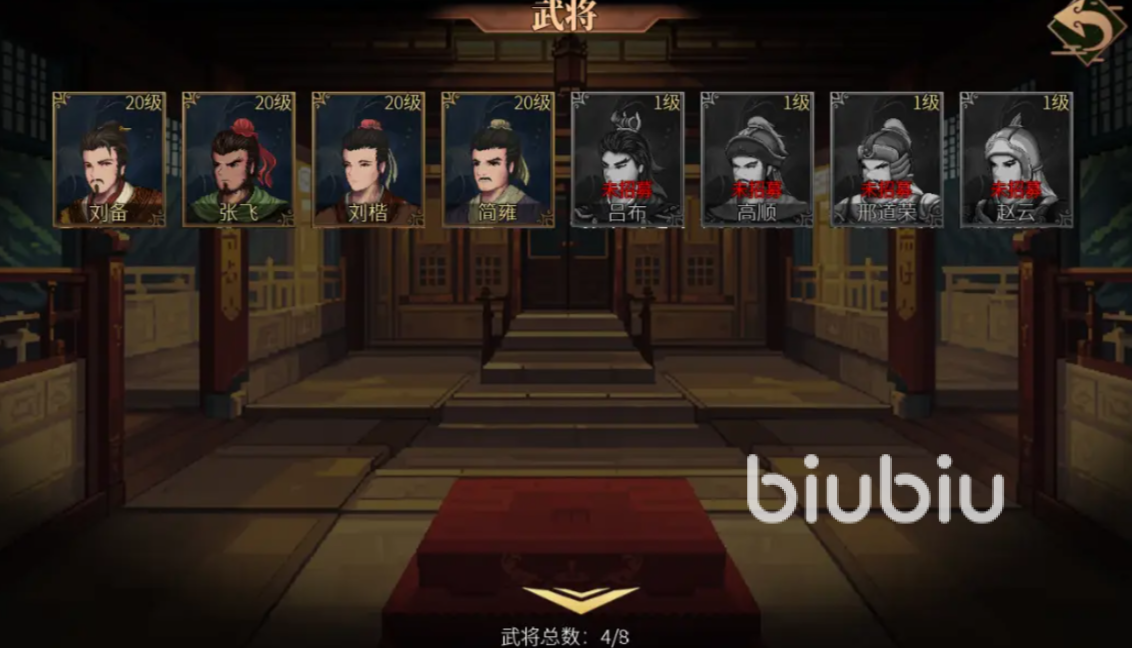 目前武将总共有下图中的8位,他们有6类基本属性,分别是体力、策略、勇武、智谋、统率和时运,体力也就是生命值,策略在进行消耗后能释放出技能,勇武和攻击力相关,每消耗2点的勇武能增加1点攻击力,智谋和精神相关,每2点增加1的精神力,统率和防御相关,同样每2点加1点,最后的时运和增益buff有关,除了基本属性外,大家还能在面板查看攻击、防御、精神、回避、格挡、连击、暴击和移动这8大数值;