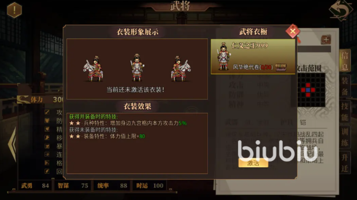 除了常规的升级外,每一个角色都会有专属的时装,激活能获得强化效果并获得特技,比方说体力上限提升,或增加身边友军攻击力等,大家也可以训练手上的角色,上面介绍的六大基础属性都是可以通过训练来提升的,六项属性的训练上限为体力200点、勇武、智谋、统帅和运气皆为100,策略是40点,最后消耗军资还可以让角色升迁,升迁后的角色能选择兵种,不同的兵种会带来技能和属性上的差异,大家可以根据当前手中的阵容搭配来选择合适的择转职方向。