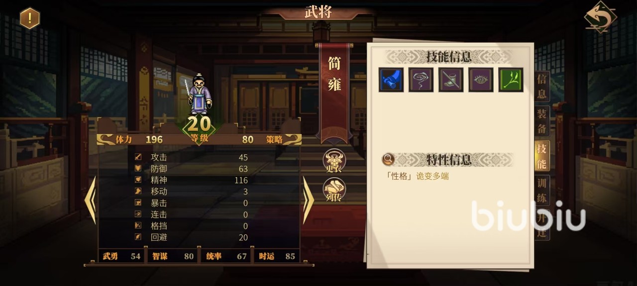 2025年04月24日 16:24 来源:倔强与呆呆兽在游戏中简雍是大家前期就可以使用到的一名武将,他也是刘备在求学时的好友,后续成为刘备重要的幕僚,今天小编来分析一下建安外史简雍怎么样。这名武将在属性和技能方面都很有特点,它也是属于常用的人物之一,为了能够发挥出优势,大家需要先了解清楚他的技能以及转职情况。