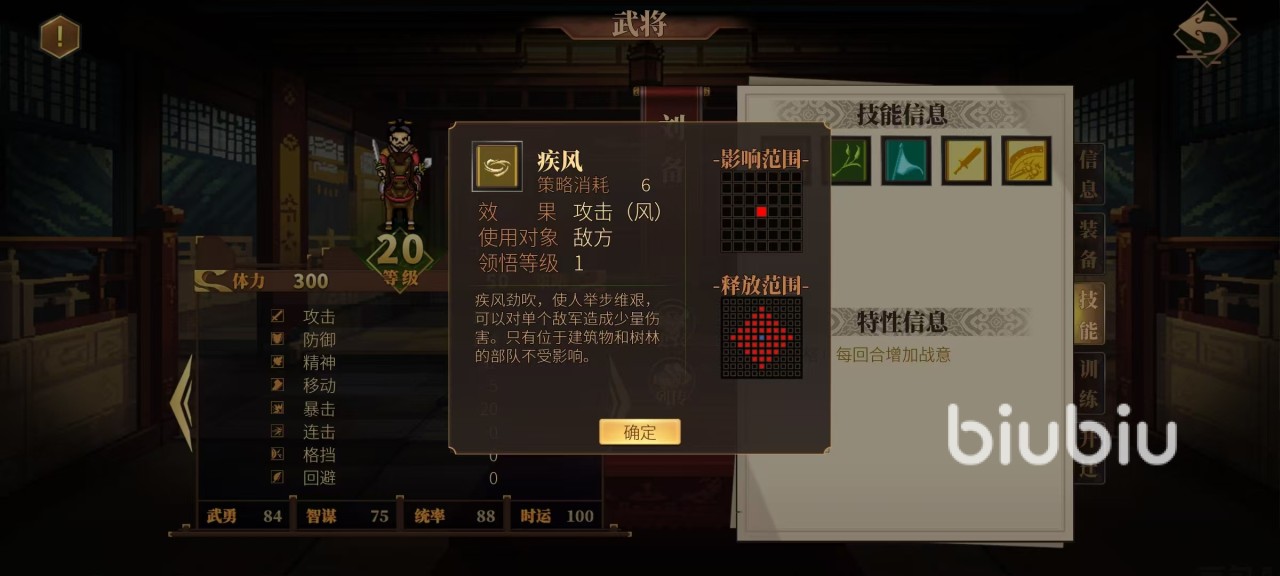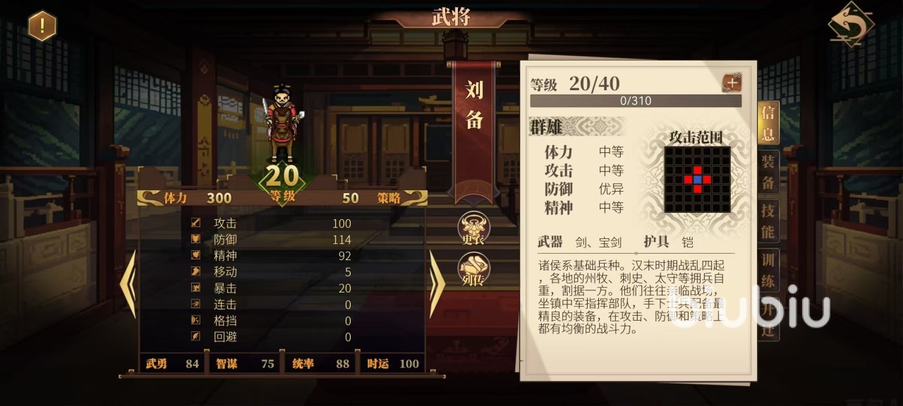 在游戏中,刘备是大家体验剧情的绝对核心人物,也是一开始就使用到的,所以了解他的技能也非常关键。在属性方面,刘备的体力、攻击和精神都是中等,但防御属于优异,所以在防御方面有着不错的表现。他所使用的武器是剑,护具是铠。技能主要包括疾风、医疗、觉醒、振奋和集中这几个。疾风的效果是对单个敌军造成少量伤害,只有位于建筑物和树林中的部队不受影响,医疗对自己或者是友方释放,能恢复我军单个部队的少量体力值。