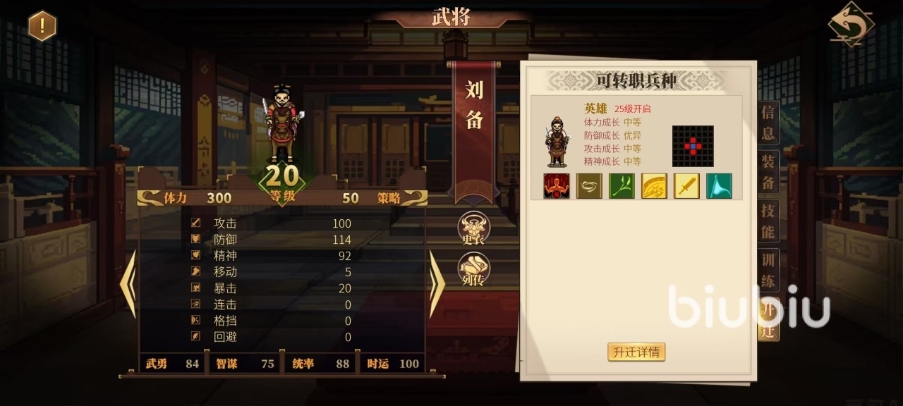 刘备后续达到25级时可以开启转职,转职之后拥有更多的技能,主要增加霸气、灼烧和同仇这几个。霸气的效果是在一定回合之内,自身攻击力、防御力和精神力全部上升20%。灼烧效果是释放一束火焰,对单个敌军造成灼烧伤害,在雨雪天气下是不能使用的,如果敌人位于湿地。荒地或者是山地则不受到影响。同仇是将自身积累的战意转替给身边战友身上。