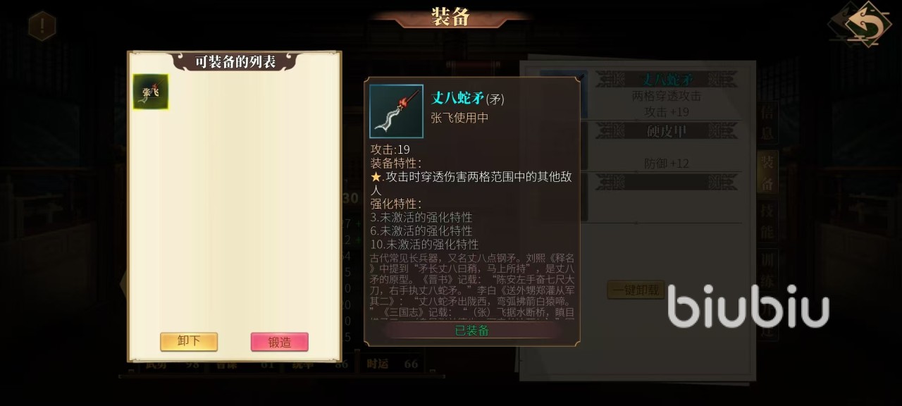张飞是属于游戏中的轻骑兵类型,它的体力中等,攻击优异,防御优异,精神平常,无论是在输出还是生存等方面都非常出色。使用的武器是矛,护具是铠。轻骑兵是基础兵种,骑乘战马,移动力和攻击力非常优秀,还具备反复冲击敌人的速度和灵活性。张飞使用的武器丈八蛇矛,在攻击时能穿透两格范围内的其他敌人,后续还有更多的强化特性,所以输出的伤害很可观。