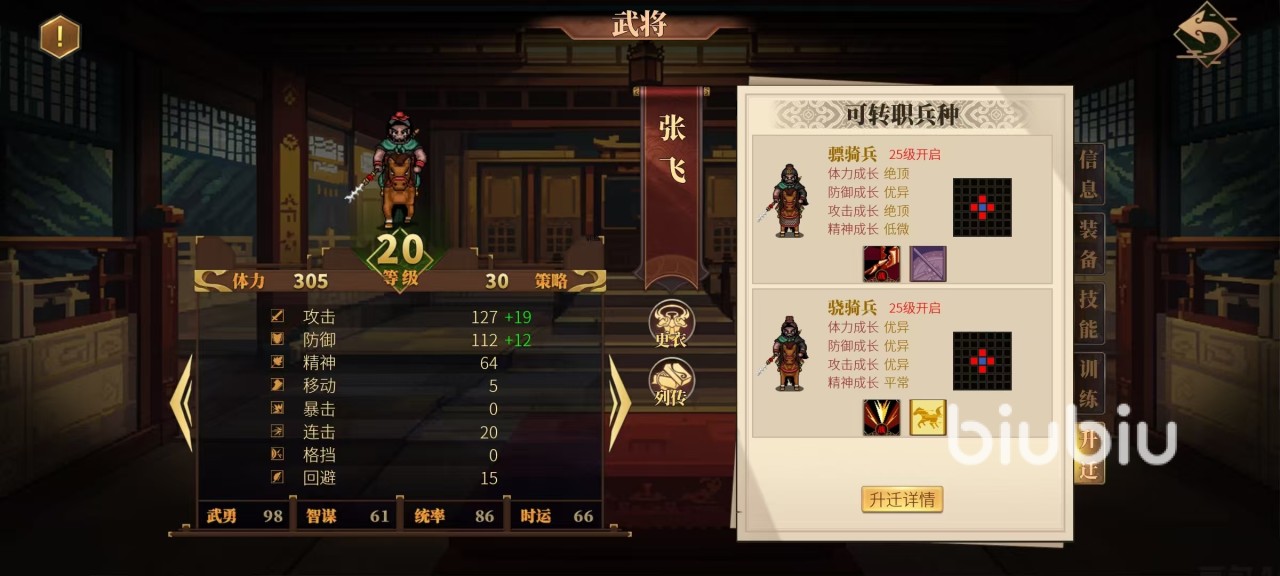 升迁才可以获得技能,升迁有两个方向,分别是骠骑兵和骁骑兵,都是25及时开启的转职。骠骑兵的体力成长绝顶、防御成长优异、攻击成长绝顶、精神成长低微,具备突破和威压这两个技能。骁骑兵的体力成长优异、防御成长优异、攻击成长优异、精神成长平常,具备的技能是迅猛和强行。这两个转职方向有着一定的不同点,骠骑兵更倾向于攻击方向,而骁骑兵更均衡一些。