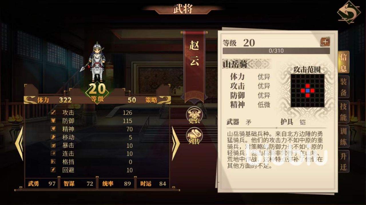 游戏中的赵云是属于山岳骑,他的体力优异,攻击优异,防御优异,精神低微,在前三项属性方面都很出色,是初期就可以打出不错属性的武将之一。山岳骑基础兵种是来自北方的游牧骑兵,虽然在攻击力方面不如中原重骑兵,但是非常擅长在山地、荒地中作战,这样的特点弥补了在其他方面的不足,所以赵云可以应用于很多战斗场景下。