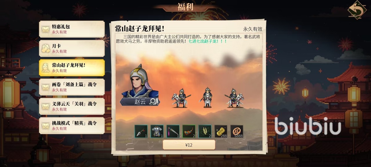 如果大家想要获得赵云,那么是需要通过充值购买的方式得到的,在福利中可以直接找到常山赵子龙拜见这个活动,这里花费12块钱就可以将这名武将纳入到自己的麾下。赵云使用的武器是矛,护具是铠,它的特性是老成持重和疾风攻击这两个。老成持重效果是使得受到的所有伤害都能减轻20%,疾风攻击的特点是对移动力越低的敌人,造成的伤害也就越高。这两个特性的加入,让赵云在攻防两端都有着更强势的表现。