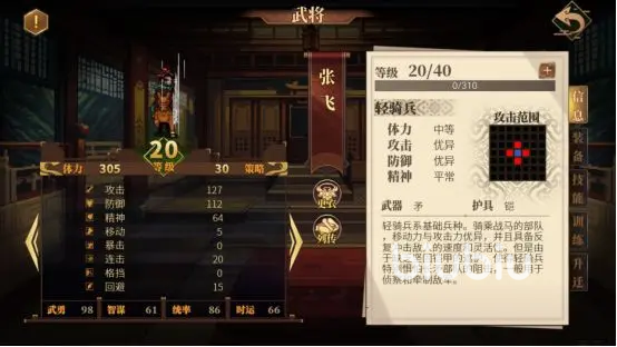 3、张飞,这则是比较具有代表性的坦克型角色,可升迁为重骑兵,武将升迁后,能明显的提高该角色的生存以及防御能力,让他在战场上更加的无坚不摧,装备上,可以代盾牌,能提高格挡率,或者是抗伤害的装备也可以。
