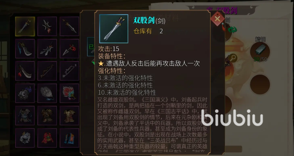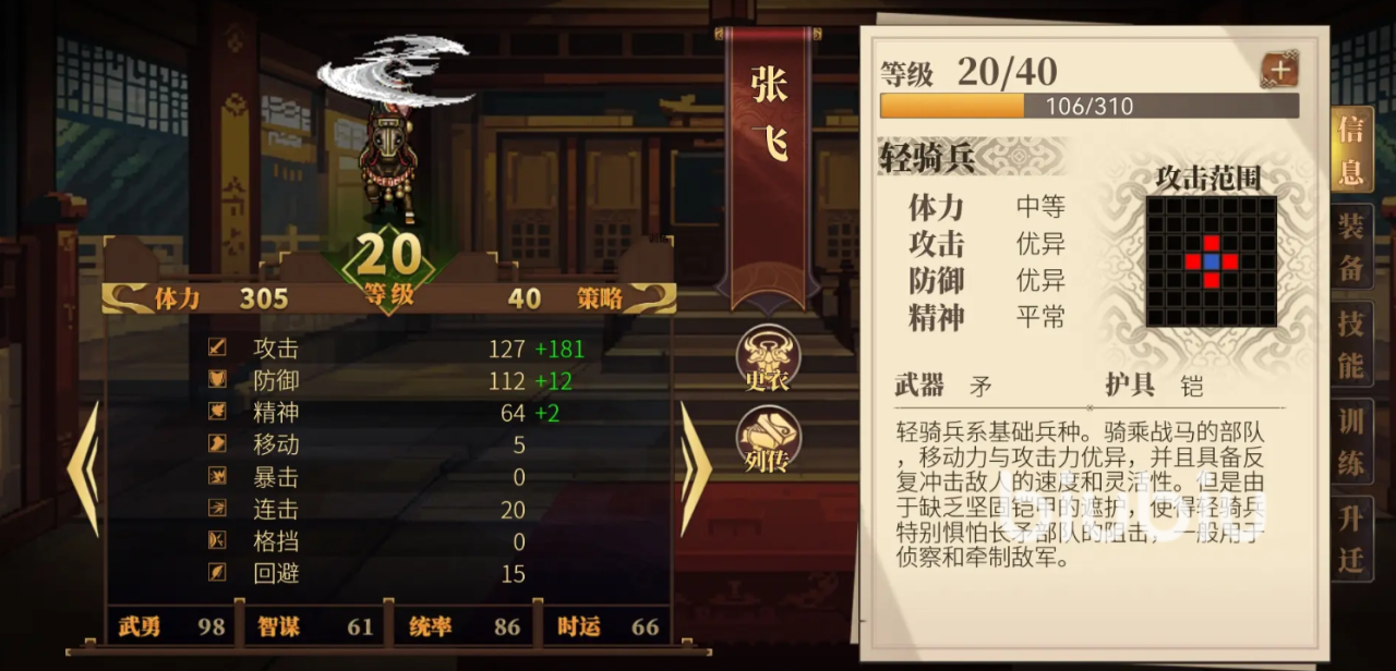 装备的分配同时和属性同理补短板,让防御低的武将拿好装备,新手挑选装备需要注意由于战斗中90%的伤害都来自于物理攻击,所以格挡的重要性要远大于闪避,比方说张飞就建议转重骑兵拿盾牌,最后的装备锻造优先选伤害即可。