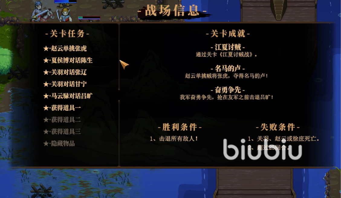 其实这个关卡颇为复杂,在地图上除了拥有各种复杂的地势之外,还需要进行陆战、海战,所以要及时注意对手的埋伏。刚开始大家从陆地出发,可以先派遣关羽或者其他骑兵进行冲锋,若是成功击退所有人的话,即可拿下胜利,不过关键人物不能阵亡。