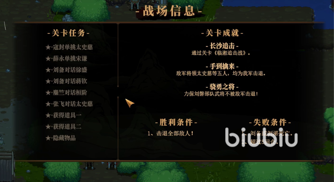 大家先来看一下获胜的条件吧,首要获胜条件便是击退所有对手,然后主要人物刘备、刘泌不能阵亡,并且回合数要控制在五个之内。所以要求还是颇为苛刻,另外还要保证刘磐部队不会被击退,最终才可解锁所有成就!