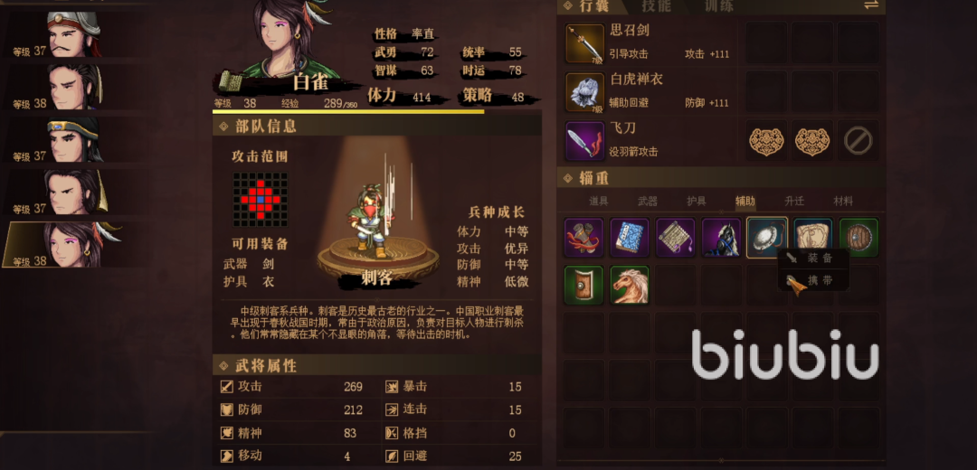 在游戏的武将体系里,白雀的能力非常厉害,她可装备强力武器思召剑,此剑能增加白雀15%的攻击力与10%的暴击几率。搭配白虎衣,白虎衣赋予白雀20%的物理防御力加成,使其在战场上的生存能力显著提升 。从属性成长角度看,当玩家将她的武艺提升到90,统御提升到70时,她的综合战斗能力将得到全面升华。此时,白雀的防御力甚至超越游戏中以高防御著称的夏侯博,在战斗中,敌方往往会优先攻击拥有100格挡的夏侯博,从而让白雀能在相对安全的环境下发挥作用,或进行补刀,给予敌方残血单位致命一击 。