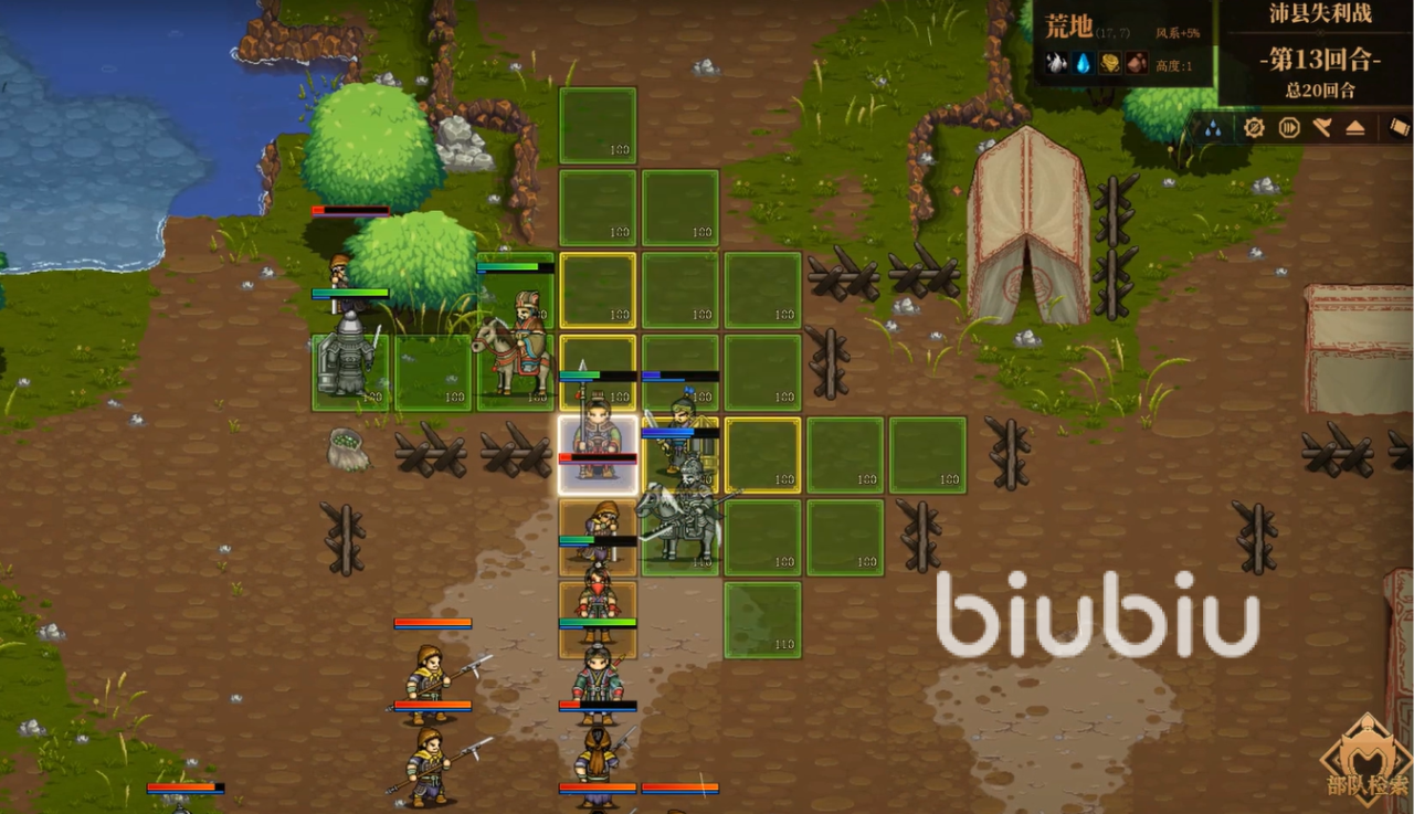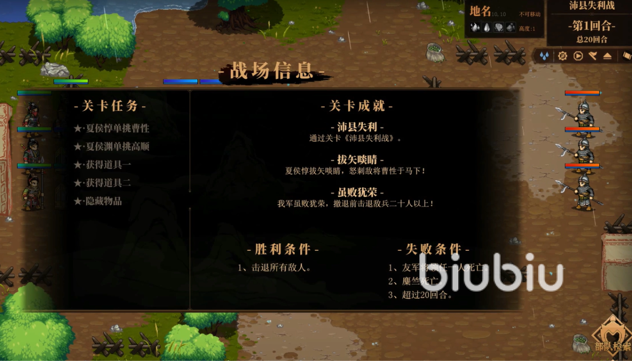 由于这个地图采用了横长的地形,所以大家的发挥空间就大了,不需要将角色分散开来。想要获胜的话,就需要击退所有人,然后保证将领没有任何一人阵亡,并且在20个回合内结束游戏。不过建议先看一下整体的地形,这样才方便安排将士。