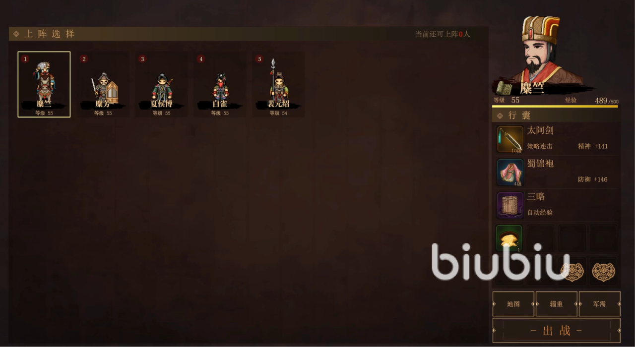 由于这个关卡中所限制可上阵的角色有限,所以更加推荐使用糜竺+糜芳+夏侯博+白雀+裴元绍,它们的综合实力都很强,并且可有效辅助或者进攻。不过角色数量少,所以每个角色都要培养好,例如佩戴高等级装备或者使用各种属性加成道具。