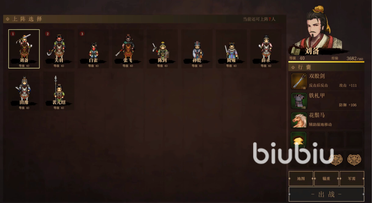 首先第一步要做的就是进行上阵人员的队伍搭配,这里首先推荐刘备,作为首领不仅武力超群,又可以加各种buff。二号位的话,就可以用关羽,同样实力非凡。然后剩下的位置大家可根据自身的角色去选择,一般搭配远程输出+坦克+辅助即可。