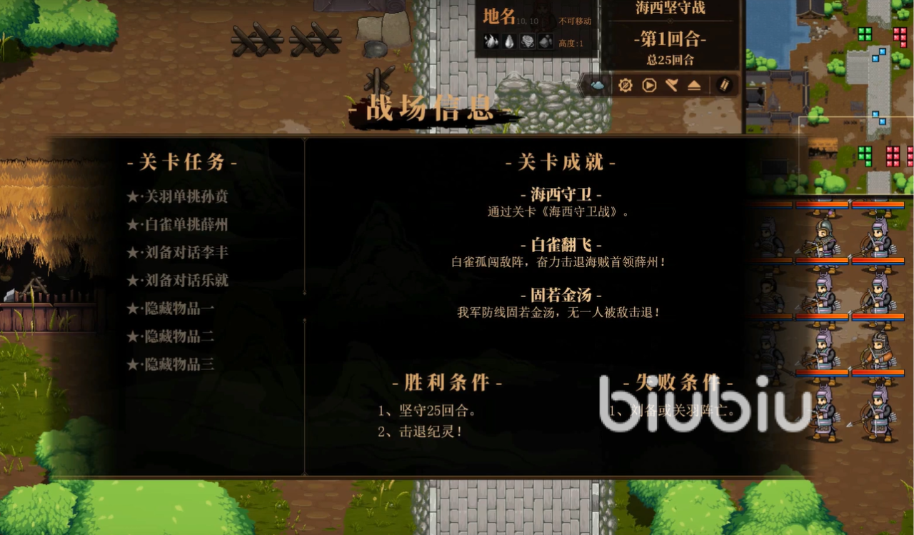 之后就可以发起进攻了,可以发现敌军都出现在地图的右边,随着一阵对话之后,就会出现获胜条件。这时要坚守好我方的城市,并且将敌军给击退,然后还要避免刘备、关羽阵亡。最后还要击退纪灵,并尽量保护好所有人。