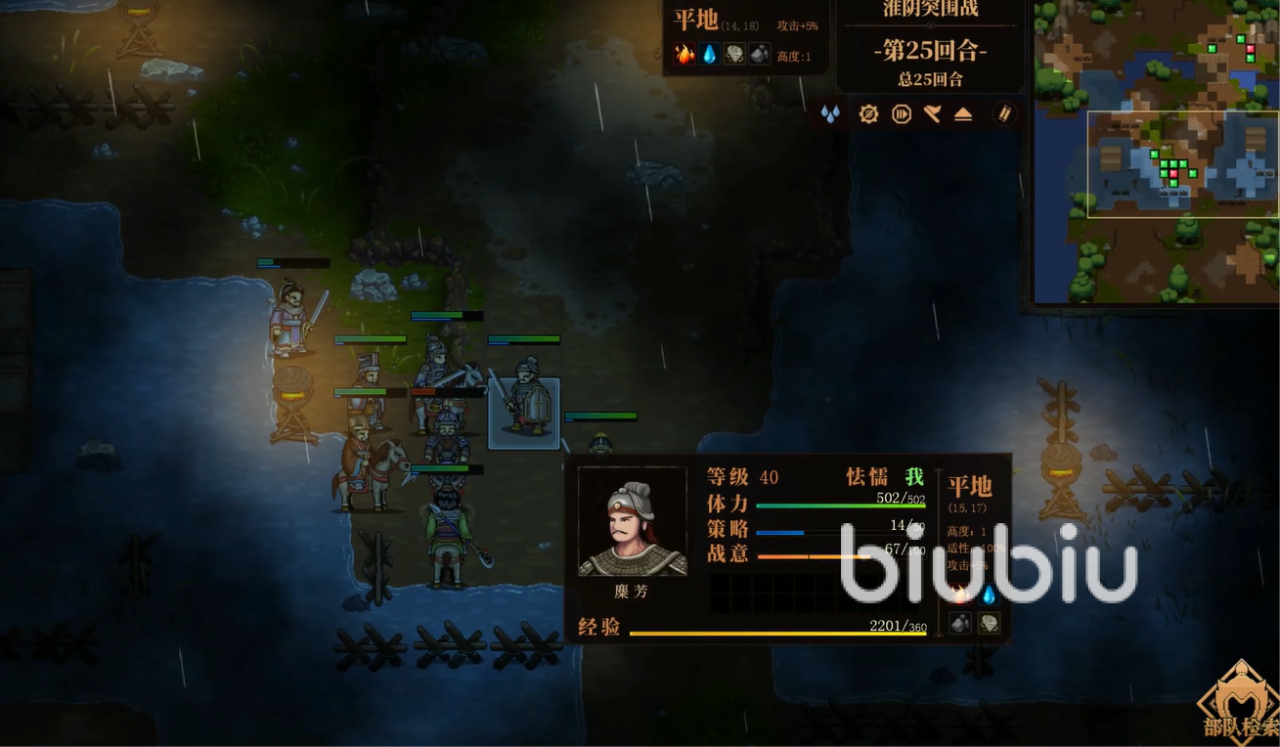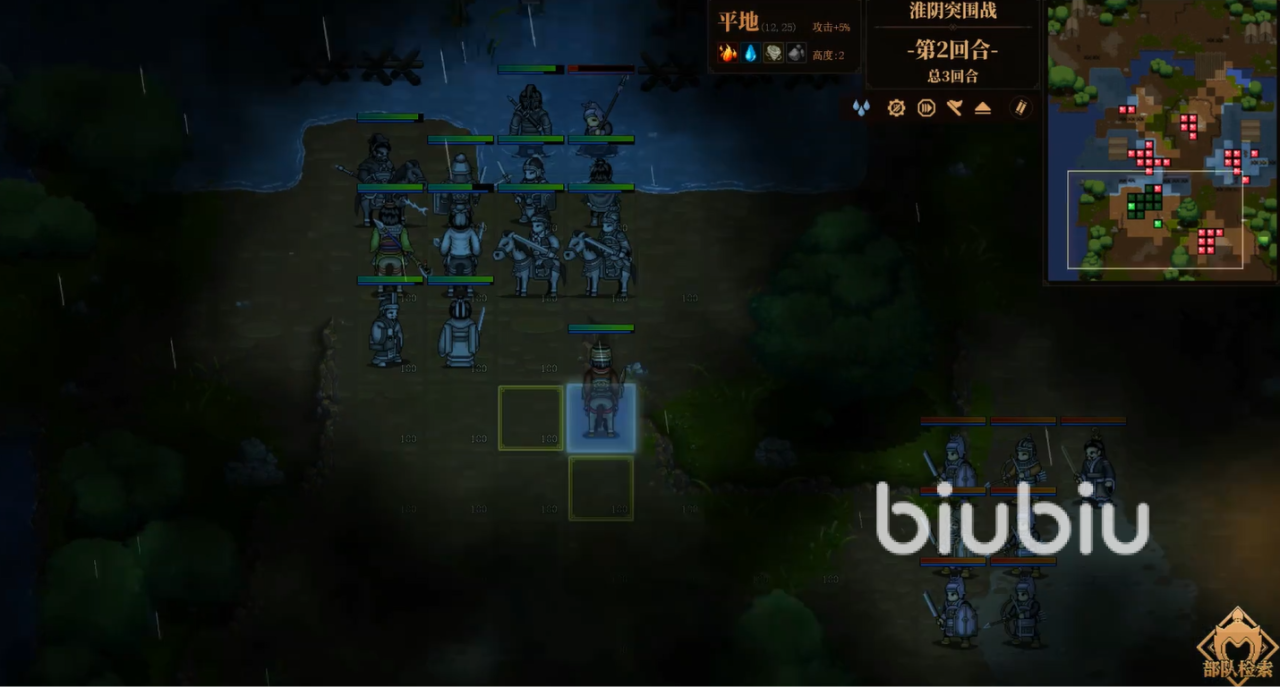 由于这关的地段处于阴雨天气,并且周围幽暗,所以需要先派遣一些士兵探查。所以大家无法纵观全局,但是隘口的地方颇为明显。还是老样子,先派遣关羽或者骑兵在前方挡着,这时大家要击败前方的将领,然后顺利接触夏侯博之后,才可以荣归故里。
