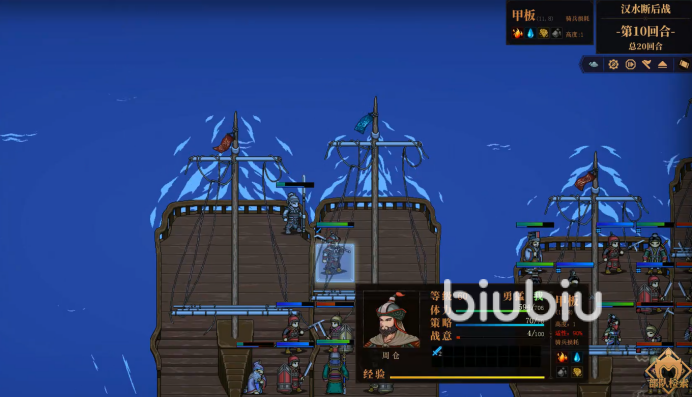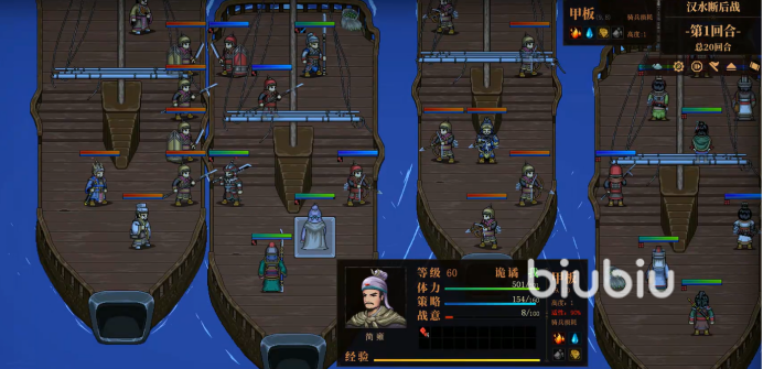 其实这关要求大家成功渡海,另外还要击退所有的敌军,最终保护关羽不死亡,并且回合数不超过20。刚开始建议将近战角色放在左右两边,这样即可掩护其他队友,然后又可以及时进攻。接着辅助就为所有角色加buff,避免大家落后更多经验。