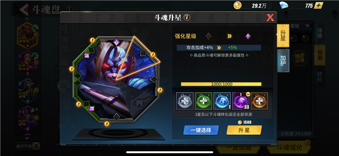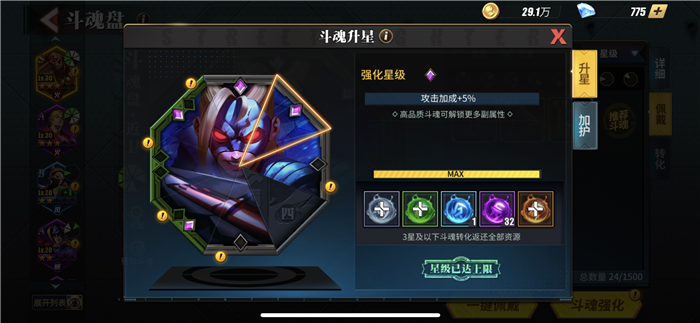在斗魂盘中如果需要强化斗魂给斗魂升星就需要消耗大量金币,提升一星就需要消耗1500金币。每个角色都可以安装斗魂盘,所以升级斗魂盘是一笔很大的开销。建议玩家给首发的角色安装高星级的斗魂盘。
