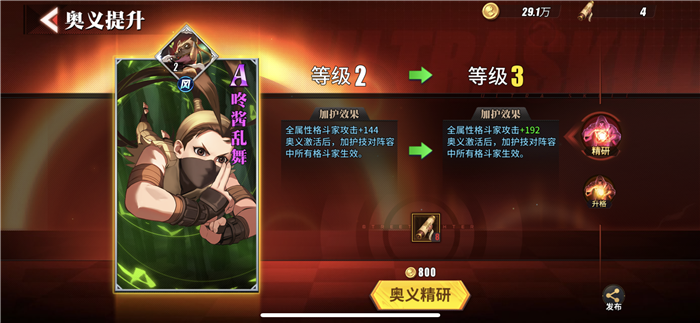 想要提升奥义除了需要格斗密卷还需要大量金币,如将奥义从2级提升至3级则需要8个密卷外加800金币,等级越高消耗的金币就越多。