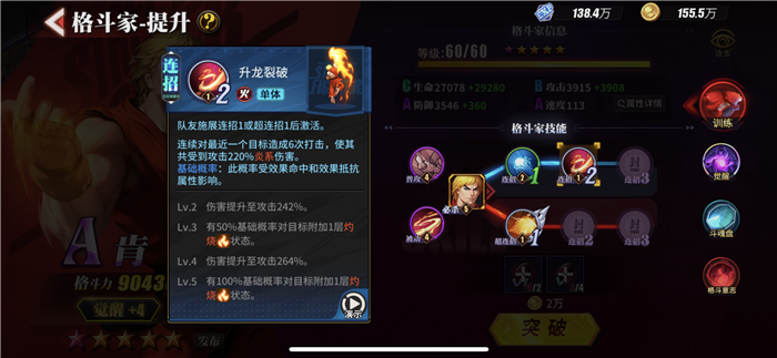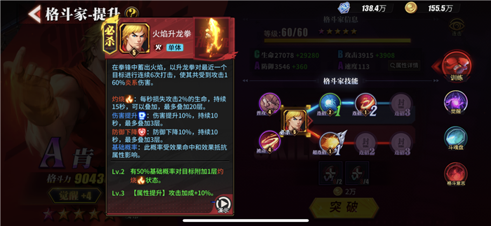 必杀技为火焰升龙拳,这一招式玩家都不会陌生,肯可以攻击最近一个目标造成160%火焰伤害。并造成灼烧效果使敌人每秒损失攻击2%的生命同时敌人防御下降10%。