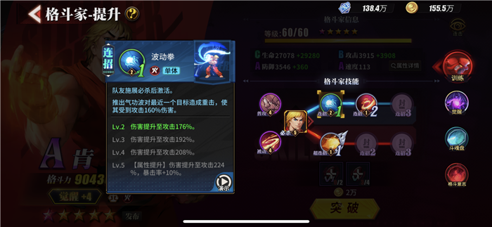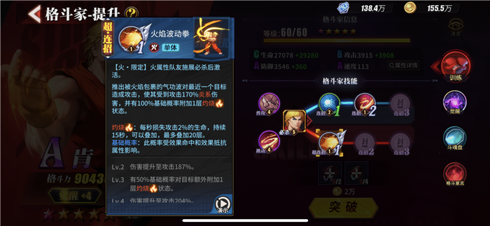 而技能火焰波动拳使用时有一定条件,需要前一个释放技能的格斗家与自身属性相同,此时攻击最近一个目标造成170%火焰伤害。