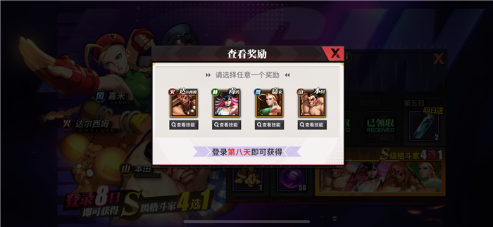 连续8日登陆就可以轻松领取一个s级格斗家。但只能从达尔西姆、本田、毒药、嘉米这四个格斗家中选择。