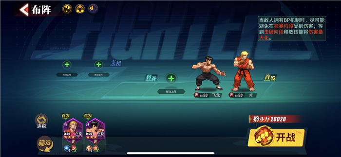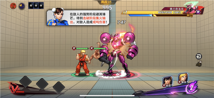 这一关卡只能够使用肯和飞龙这两个格斗家所以想要靠大量输出强行通过是不可能的,在游戏开始前的准备期间系统会提示此次过关的小技巧,此次boss在一定阶段会处于狂暴状态,此次敌人的伤害值成倍增加,只有在敌人处于击破阶段时才是释放技能的最佳阶段。