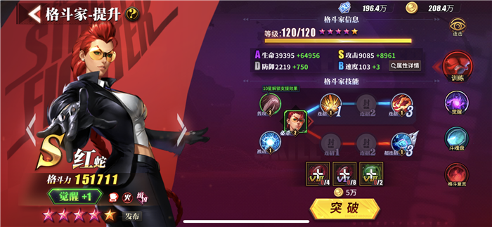 红蛇是s级火系格斗家红蛇的攻击力与生命力比其他输出型格斗家要好,是具有一定生存能力的输出型角色,缺点就是速度不快防御力略显薄弱。