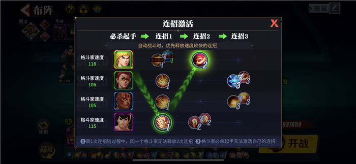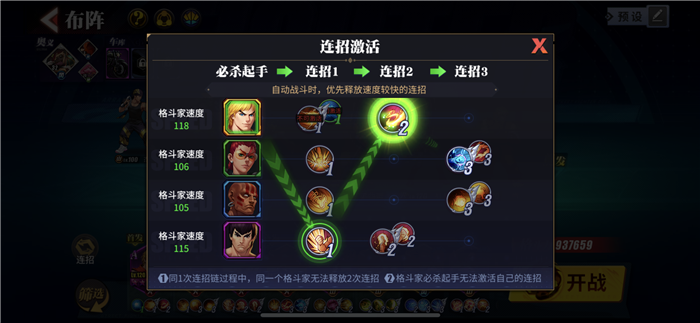 每个格斗家的速度不同,自动战斗时,优先释放速度较快的连招。同1连招链过程中,同一个都将无法释放2次连招。格斗家必杀起手无法激活自己的连招。